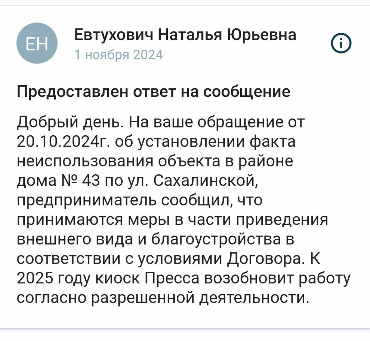 «Был дан ответ, что собственником предпринимаются меры по внешнему виду торгового объекта и благоустройству, а также, что киоск должен возобновить работу к 2025 году. К сожалению, на сегодняшний день ничего не изменилось, объект не работает. Если возобновление работы не предвидится, прошу рассмотреть вопрос о вывозе торгового объекта с последующим восстановлением газона», — говорится в новой жалобе.