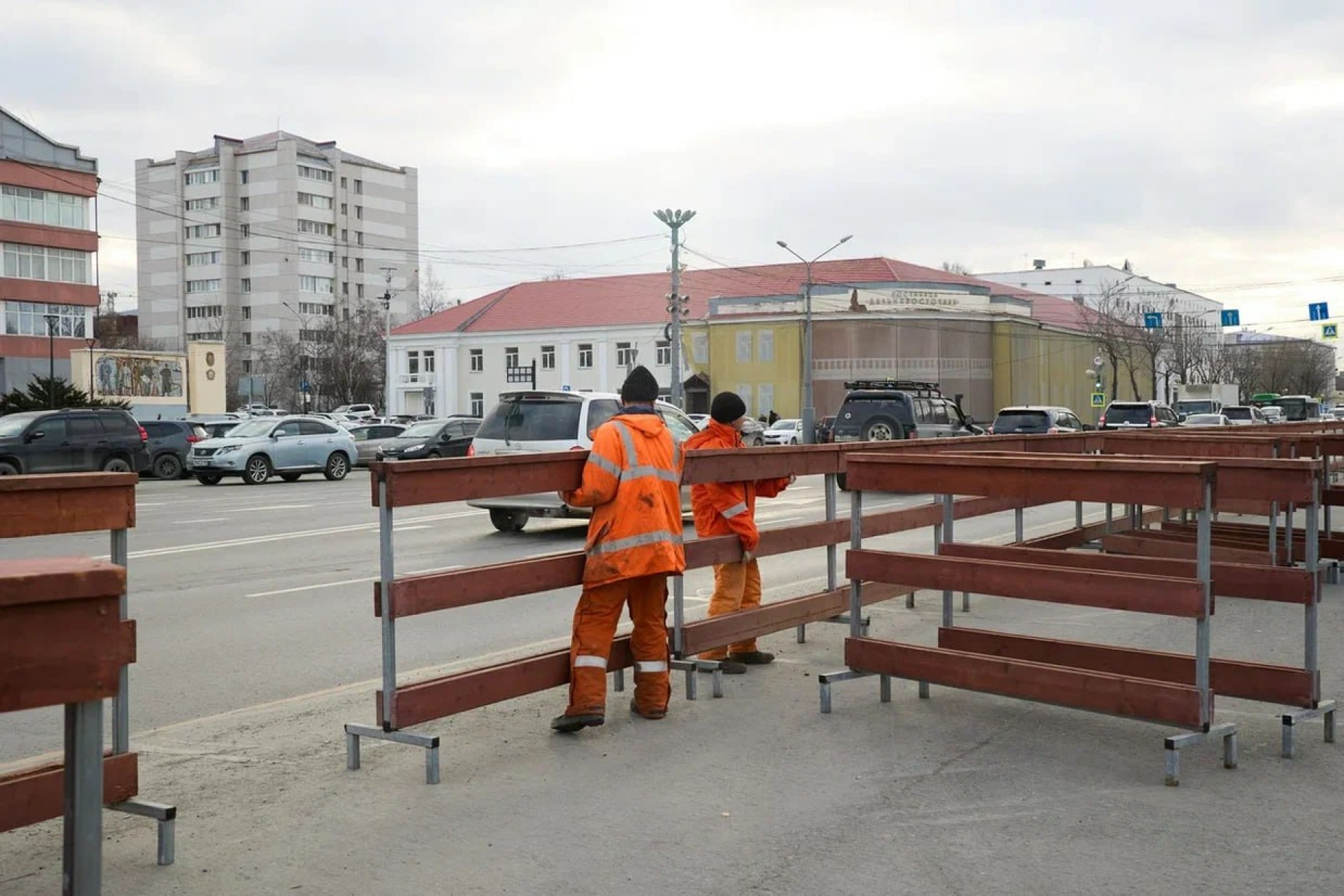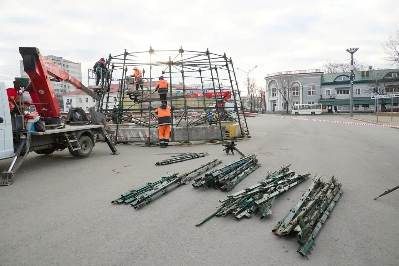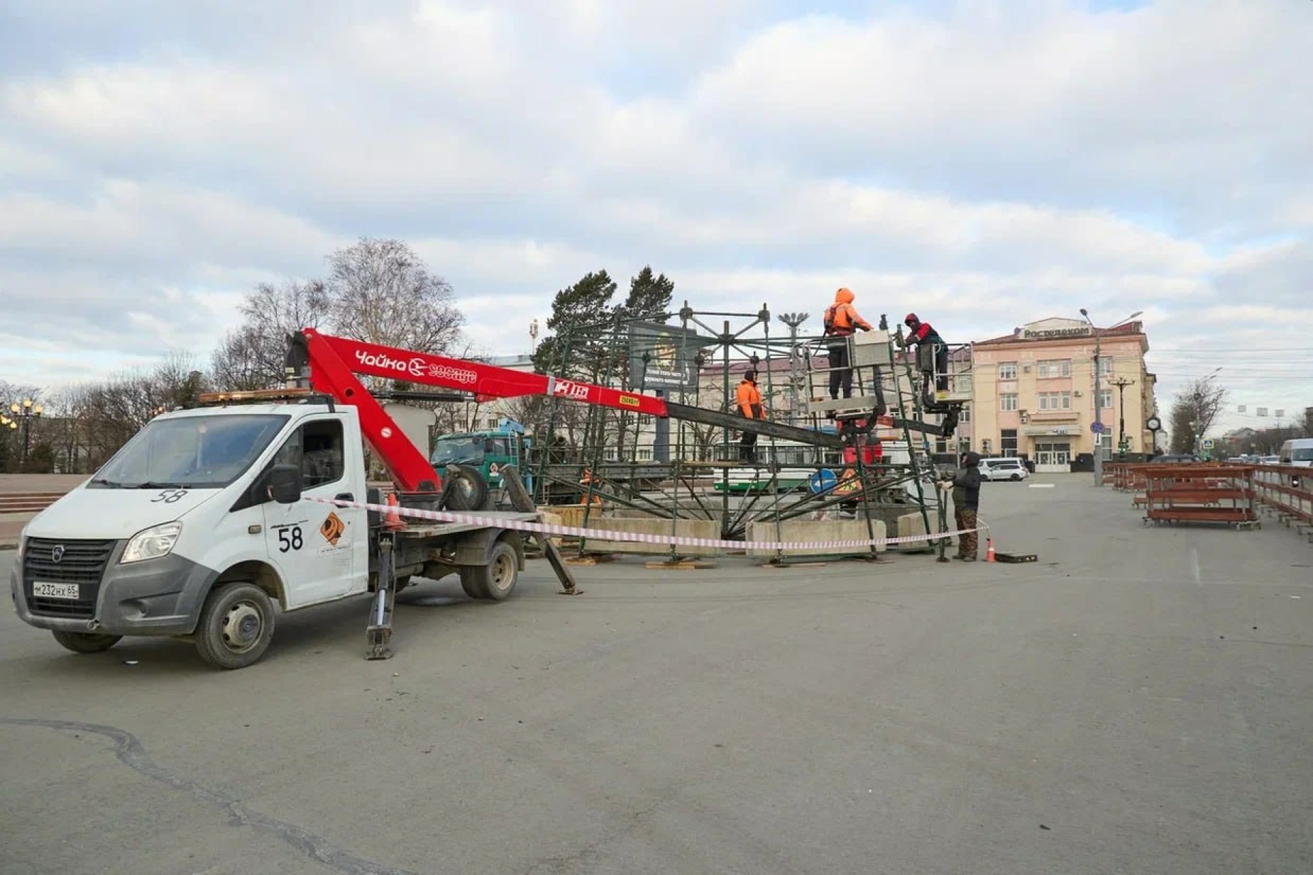 На площади Ленина в областном центре начали собирать новогоднюю ель. Бригада специалистов сегодня смонтировала каркас нижних ярусов. Учитывая островную погоду, особое внимание уделяется устойчивости конструкции.